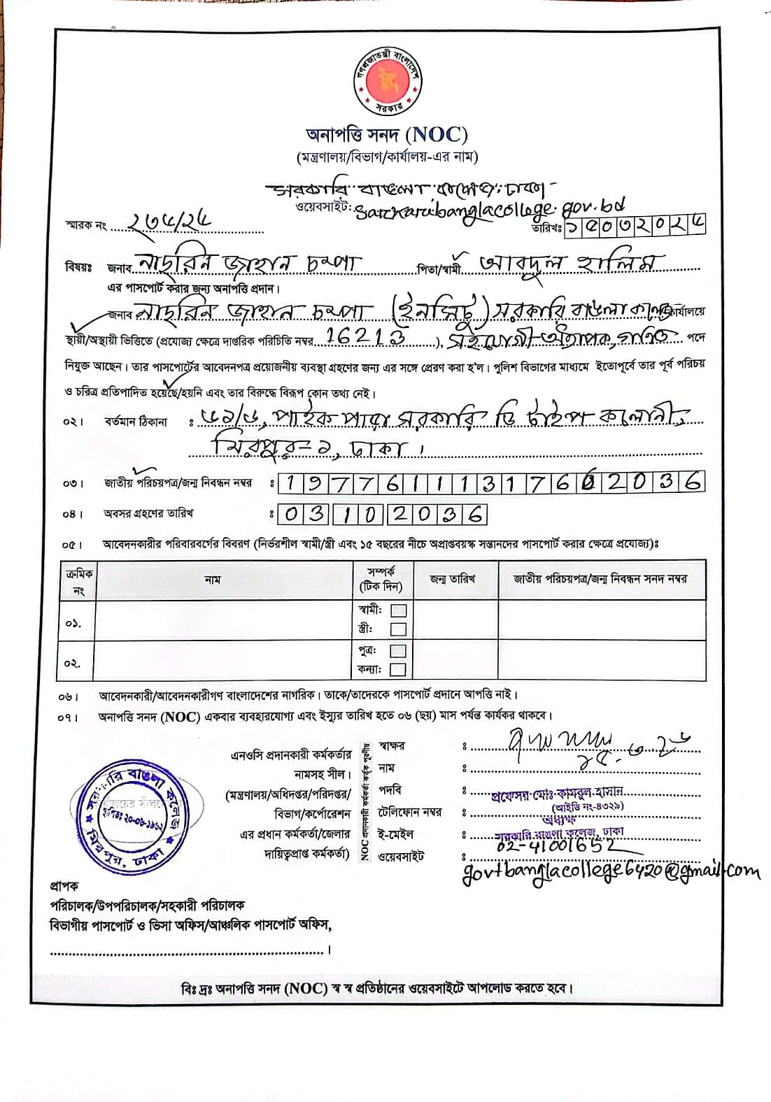 জনাব নাছরিন জাহান চম্পা, সহযোগী অধ্যাপক, গণিত বিভাগ এর অনাপত্তিপত্র