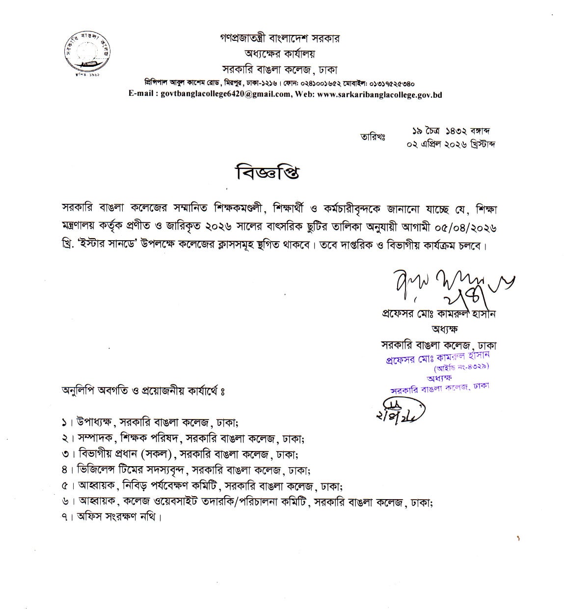 প্রফেসর মো. কামরুল হাসান, অধ্যক্ষ