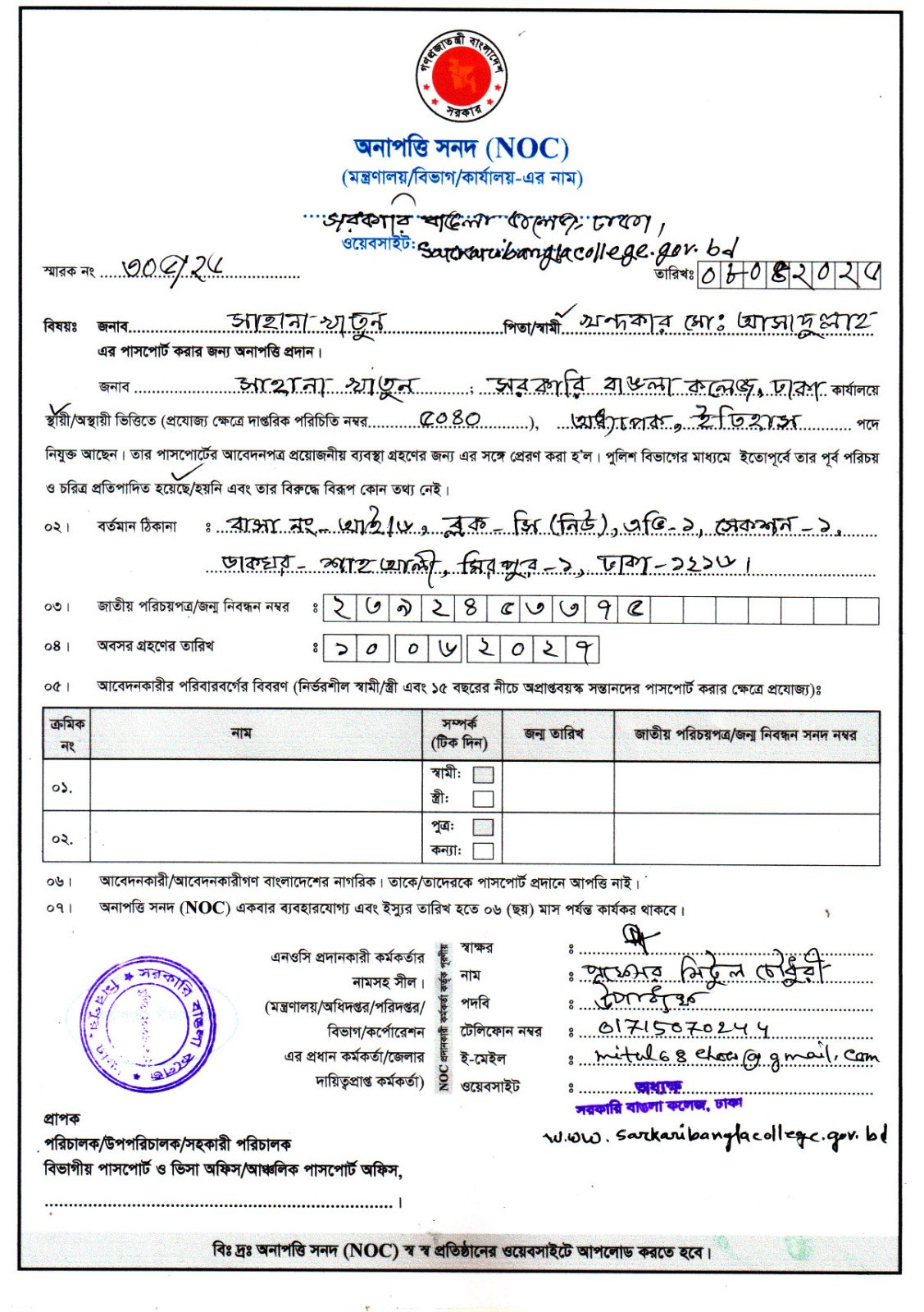 প্রফেসর সাহানা খাতুন, ইতিহাস বিভাগ এর NOC সংক্রান্ত