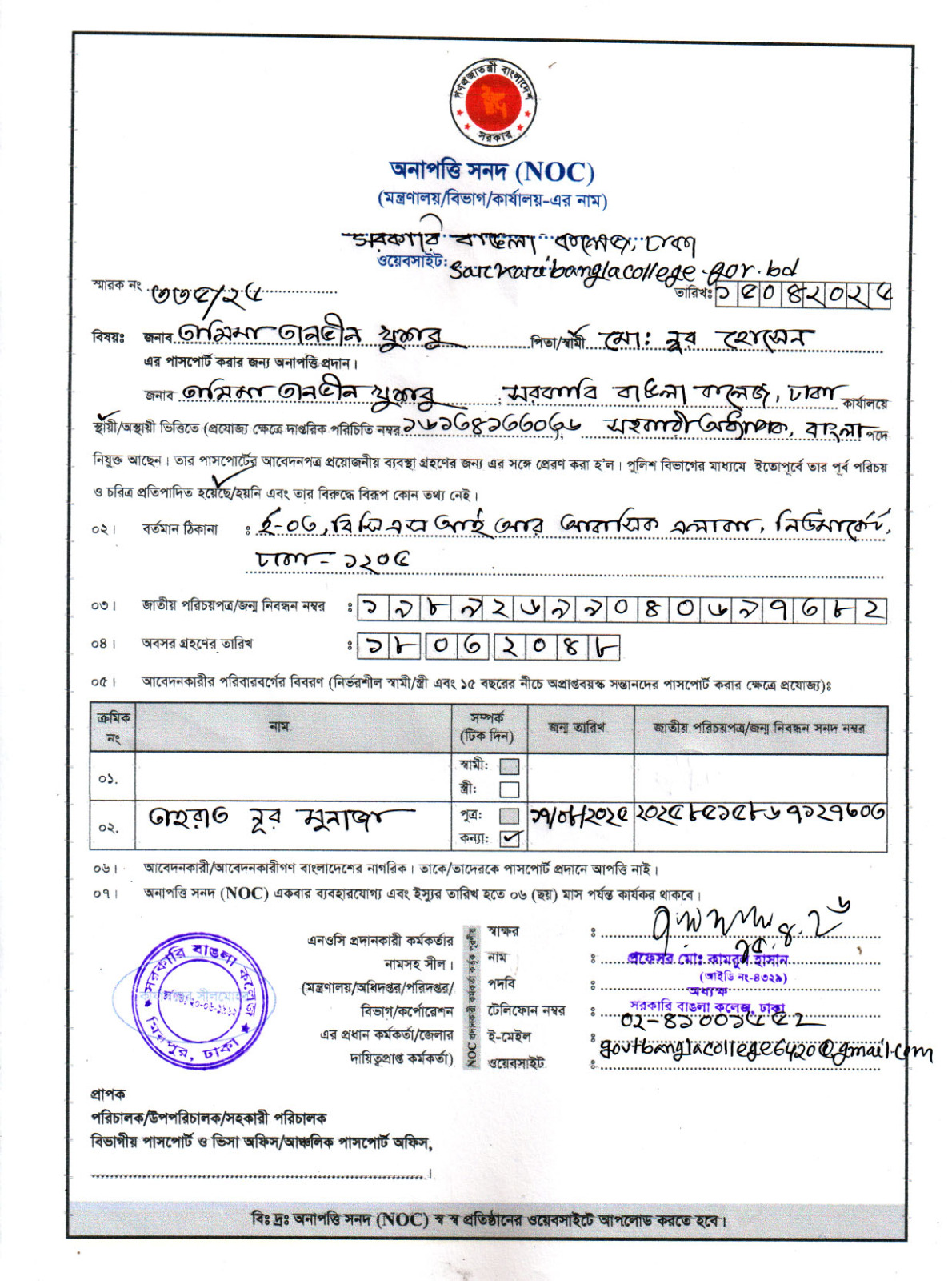 তামিমা তানভীন খুশবু, সহকারী অধ্যাপক, বাংলা এর NOC